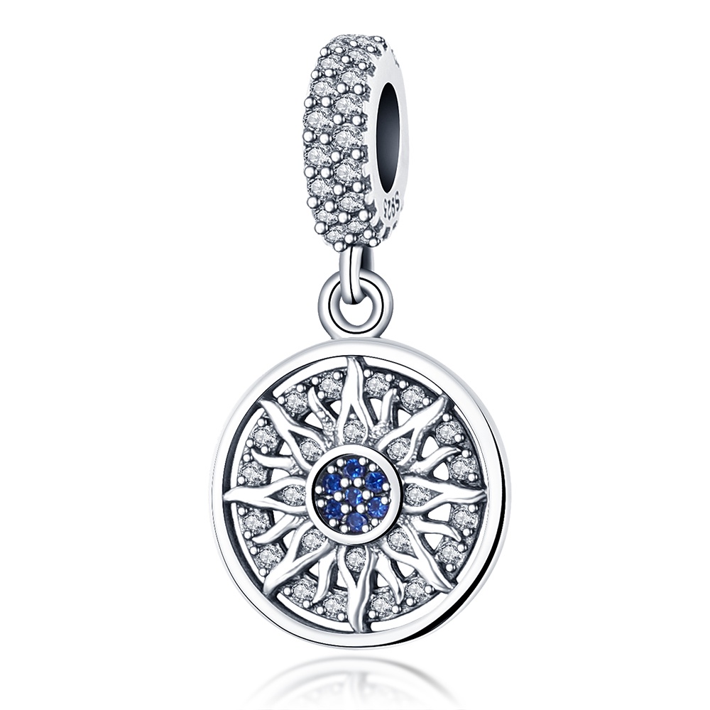 Звездно сияние носи магията на нощното небе и символизира вечната светлина и вдъхновение. Изработен от сребро 925, той е украсен с изящен кръгъл дизайн, наподобяващ слънце или звезда, с блестящи инкрустации от циркони и дълбокосин кристал в центъра. Халката е обсипана с допълнителни кристали за допълнителен блясък. Идеален за добавяне към вашата гривна или колие, този талисман изразява стремеж към светлина, надежда и безкрайна енергия. Прекрасен подарък за тези, които гледат към звездите и мечтаят за необятното.