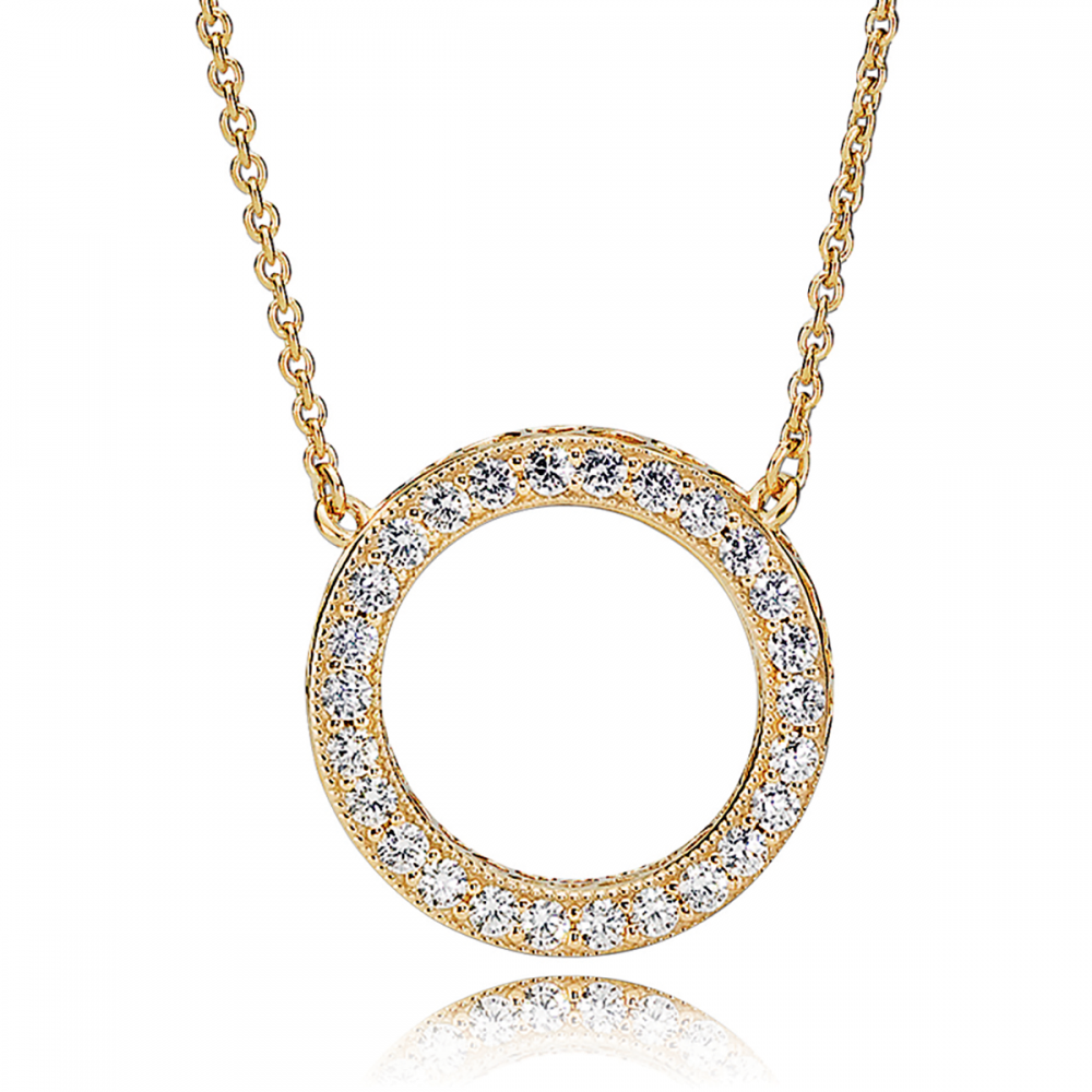 Кръг на вечността е символ на безкрайността, хармонията и съвършенството. Изработено от фино златно покритие, това елегантно бижу впечатлява със семпъл, но луксозен дизайн – кръг, обсипан с блестящи кристали, които придават изтънчен блясък и стил.