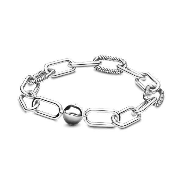Изработена от висококачествено сребро 925, тази гривна впечатлява с геометрични звена, редуващи класически и усукани елементи, създавайки фин, но модерен контраст. Гладката сферична закопчалка придава завършеност и хармония, като допълва нежното излъчване на гривната.
